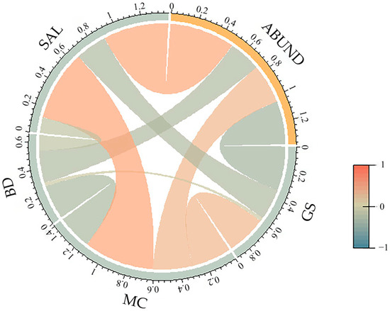 Correlations between the physicochemical properties of the sediments (GS: grain size, MC: moisture content, BD: bulk density, and SAL: pore-water salinity) and the abundance of microplastics (ABUND). Note: The band within the circle represents the correlation between the two variables. The red band indicates a positive correlation, whereas the green band indicates a negative correlation. The intensity of the color and the width of the bands reflect the correlations (more positive or negative).