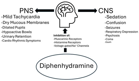 Given that diphenhydramine has been revealed to be riskier than expected, even at safe doses, diphenhydramine taken in overdose can even further endanger patients’ health. Diphenhydramine overdose typically results in a presentation of anticholinergic toxicity that can manifest both in central and peripheral nervous symptoms, the severity of which depends on the dose [], see Figure 1. In mild oral overdoses of less than 300 mg [], the patient usually presents with symptoms including tachycardia, dry mucous membranes, dilated pupils, hypoactive bowel sounds, and urinary retention []. Higher doses can also result in agitation and hallucinations []. In doses greater than 1 g, symptoms may also include seizures, delirium, psychosis, rhabdomyolysis, coma, and death []. Extreme overdoses can elicit adverse cardiorhythmic symptoms as well [,]. Other symptoms often observed in diphenhydramine overdoses include confusion, drowsiness, and respiratory depression []. Adults most commonly present with sedation and coma while children may be more likely to also experience agitation [], hallucinations, and seizures [].