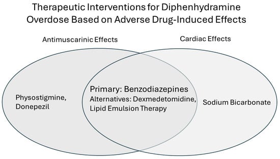 In order to manage rising diphenhydramine overdose rates, effective treatments are needed more than ever. Healthcare professionals should familiarize themselves with the available treatment methods for diphenhydramine overdose. Currently, in lieu of a specific antidote for diphenhydramine toxicity, standard treatment for diphenhydramine overdose cases has remained supportive care [,,,,], with the administration of benzodiazepines for seizures and agitation [,], and sometimes hemodialysis when needed []. However, benzodiazepines poorly manage agitation symptoms in most patients, and can even cause adverse effects such as respiratory depression and increased delirium []. Thus, current standards of treatment for diphenhydramine overdose are often insufficient and can even be dangerous. Although research into effective diphenhydramine toxicity therapies has been limited, recent years have elucidated several promising alternate methods of treatment for diphenhydramine overdose: physostigmine, sodium bicarbonate, donepezil, dexmedetomidine, and lipid emulsion therapy.