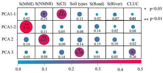 As shown in Figure 5, the distance to chemical plants in PCA1-1 has the highest degree of explanation (0.43); the distance to metal manufacturing plants in PCA1-2 has the highest degree of explanation (0.56) and is significantly higher than the rest of the variables; the distance to non-metal manufacturing plants in PCA2 has the highest degree of explanation (0.47); the soil type in PCA3 has the highest degree of explanation (0.47), and the land use type also has a some degree of explanation (0.26).