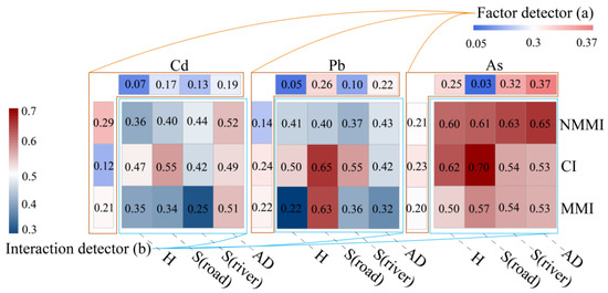 In order to identify potential contamination pathways, a combination of the factor detection and interaction detection modules of GeoDetector was employed. The identification of influencing factors was executed through GeoDetector (Figure 6a), while Figure 6b portrays the results of multiple-factor interaction detections. A large number of q values after the interaction confirmed the increment compared to the factor detection results in Figure 5. For Cd, the distance to non-metal manufacturing factories had a significant interaction with atmospheric deposition and roads, as evidenced by q values of 0.52 and 0.44, respectively. These findings suggest that Cd emissions from non-metal manufacturing factories facilitated the soil’s contamination by two pollution pathways, including atmospheric deposition and irrigation water. Similarly, the interactions between the distance of the chemical factories and the roads’ distance and atmospheric deposition indicated that traffic emissions and atmospheric deposition are the main pollution pathways for Cd emissions from chemical factories. Meanwhile, Cd pollution caused by emissions from metal manufacturing factories was affected by atmospheric deposition. In addition, the same analytical approach was employed to assess the major pollution paths of Pb and As emissions from different factories. For example, Pb pollution from non-metal manufacturing factories was influenced by atmospheric deposition, while chemical and metal manufacturing factories were primarily influenced by traffic emission and irrigation water. Concerning As pollution, non-metal manufacturing factories were linked to irrigation water and atmospheric deposition, chemical factories were associated with traffic emission, and metal manufacturing factories demonstrated a connection with traffic emission and irrigation water.