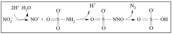 According to its mechanism (shown in Figure 2), reaction (13) will only happen if the medium is acidic since the generation of nitronium ions only occurs in the presence of H+ [29]. Therefore, the reduction reaction of nitrate to nitrite can be carried out in the presence of sulfamic acid at pH = 6.00 without reaction (13) taking place. As sulfamic acid is a strong acid, the pH of the sample ranges from 5.5 to 6.0 after removing the nitrite once the buffer solution used in the procedure below (Section 3.2) was not completely consumed.