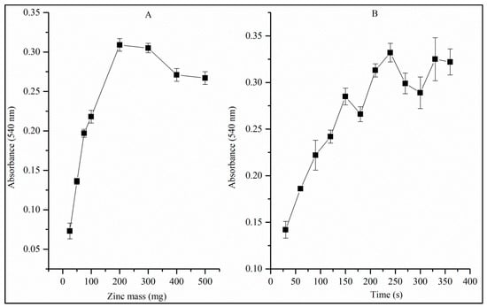 According to Figure 5A, there is a region approximately between 100 mg and 300 mg in which the reduction of nitrate to nitrite has maximum efficiency. Zinc mass above 300 mg favored the excessive reduction of the generated nitrite, according to reactions (10) to (12); moreover, Zn > 300 mg makes it difficult to measure the absorbance due to the reflection of light promoted by the large number of suspended Zn particles even after 10 min (time for the Griess reaction to occur). Therefore, 300 mg was chosen for further studies.