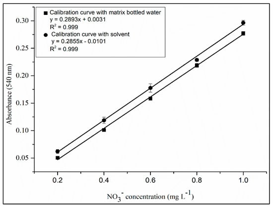 Nitrate is the most commonly found form of nitrogen and is naturally present in soils, waters, plants and meat, making it of great environmental interest [1,2]. The precise and accurate quantification of the nitrate in water for human consumption has become an object of interest in public health due to the association between nitrate intake through water and the incidence of methemoglobinemia and cancer [1,3,4,5]. Nitrate consumption is associated with the potential formation of nitrosamines and nitrosamides, which are carcinogens for humans [6]. In the USA and Brazil, the limit of nitrate (in mg of N per liter) in drinking water is 10 mg L−1 [7,8]. According to Brazilian regulations, the maximum allowed value for nitrate in bottled water is 50 mg L−1 [9].