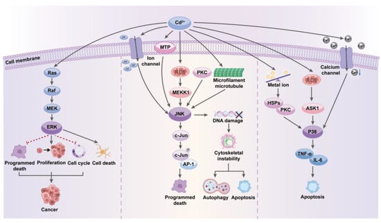Furthermore, Cd can activate the JNK pathway by altering the dynamics of the cytoskeleton, which is crucial for cells to respond to mechanical stress and morphological changes, as it modifies the polymerization state of cytoskeletal proteins like microtubules and microfilaments, potentially leading to indirect JNK activation []. However, prolonged or high-dose exposure to Cd can lead to excessive activation of the JNK pathway, impairing cellular functions associated with various structural and functional disruptions, including DNA damage, cytoskeletal instability, autophagy, and apoptosis, which may ultimately contribute to tissue dysfunction, accumulate pathogenic alterations, and promote the development of diseases such as cancer, kidney disease, and bone disorders [,].