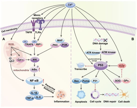 As previously mentioned, one of the initial and most direct effects of Cd entering the cell is the increased production of ROS, which not only directly damages macromolecules like proteins, lipids, and DNA but also serves as a signaling molecule that participates in various intracellular signaling pathways, particularly activating the IκB kinase (IKK) in the NF-κB pathway. The result leads to the phosphorylation and subsequent degradation of inhibitor of κBα (IκBα), releasing the NF-κB transcription factor, allowing it to move into the nucleus and activate the expression of target genes, including various inflammatory factors and cell stress response genes []. Some studies have shown that Cd enhances NF-κB activity through a ROS-dependent pathway, intensifying inflammatory responses [].