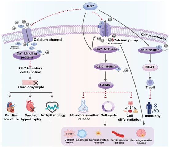 The inhibition of Ca2+-ATPase activity by Cd results in elevated intracellular Ca2+ levels, deteriorating various calcium-dependent physiological functions and disrupting cellular pathways that rely on them, specifically affecting key regulatory proteins such as calcium/calmodulin-dependent kinases (CaMK) and calcineurin []. To be more specific, CaMK, a series of functionally important kinases, is involved in regulating neurotransmitter release, cell-cycle control, cell differentiation, and various other cellular functions. Cd inhibits these crucial physiological processes by interfering with the activation and functionality of CaMK [,]. Calcineurin, primarily involved in regulating transcription factors such as NFAT during immune responses and cellular reactions, can be inhibited by Cd, a disruption that may impair T-cell activation and other immune functions, potentially leading to immunosuppression or the onset of other immune-related diseases [].