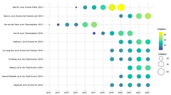 Table S8 summarizes the ten most-cited articles in the field of OPFR health risk research from 2003 to 2023, and Figure 6 displays their citation trends. Highly cited literature is a good metric for quickly understanding the current state of research in a field, and changes in the focus of these studies reflect the development trends of the research field. The study by Ike van der Veen et al. [47], frequently cited between 2012 and 2017, introduced the basic physicochemical properties of OPFRs; outlined the production and use of OPFRs before 2012; and highlighted the toxicity, analytical techniques, and contamination status of typical halogenated OPFRs such as tris(chloropropyl)phosphate (TCPP), tris(2-chloroethyl)phosphate (TCEP), and tris(1,3-dichloro-2-propyl)phosphate. Halogenated OPFRs were also the most frequently studied OPFRs before 2012. In contrast, the study by Wei GL et al. [7], frequently cited from 2015 to 2020, focused more on a broader exposure assessment of various OPFRs in environmental matrices, especially human exposure to OPFRs, and preliminarily evaluated the exposure levels of humans through air inhalation, dust inhalation, and dietary intake, suggesting that dust inhalation may be a more significant exposure pathway for humans. However, Li JH et al. [48] suggested that human exposure to OPFRs through diet is equally or more important. Their research focused on exposure to OPFRs in food, providing a detailed analysis of the contamination status of 30 types of OPFRs in various foods from countries worldwide. They observed that there are significant differences in OPFR levels between different countries or food categories; for example, grains and fats are the most contaminated products in China, while meat and fish are more severely contaminated in the United States. However, more than 22 OPFRs were frequently detected regardless of the sampling location or food group, and the problem of food contamination by OPFRs should not be ignored. The study by Wang X et al. [9], which has gained considerable attention in recent years, detailed the latest information on the detection methods, environmental occurrence, toxicity, and risk assessment of OPFRs in the relevant literature. They observed that although OPFRs in indoor dust are usually high, dietary intake is a more important exposure pathway because the consumption rate is much greater for humans (at least 1000 times greater). In fact, the bioavailability of OPFRs taken up by humans through different pathways has not yet been fully elucidated, and there are differences in the main exposure pathways for different OPFRs [49,50]; moreover, there is still substantial controversy about the mechanisms of OPFR exposure in humans, which requires further exploration. Research by Blum A et al. [51], which has gained the most attention in recent years, has continued to increase from 2020 to 2023. Blum A et al. questioned whether OPFRs were safer than PBDEs, and they conducted a detailed comparison of the two from multiple perspectives, such as environmental exposure status, toxicity testing, and the current state of epidemiological research. These authors believe that OPFRs are persistent mobile organic compounds (PMOCs), that their exposure levels in most environmental media continue to increase, that the potential exposure risk to populations has already far exceeded the peak levels during the use of PBDEs, that both halogenated and nonhalogenated OPFRs pose health risks, and that the extensive use of OPFRs requires wider attention and deeper research.