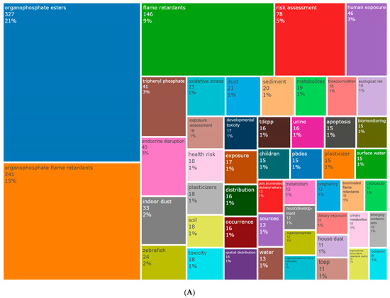 Keywords are a high-level summary of the content of studies, and analyzing the frequency and co-occurrence of keywords in the scientific literature can reveal the core themes of the research and help to identify important topics and trends in a particular field of study [57,58]. Publications related to the study of the health risks of OPFRs in the years 2003–2023 contained a total of 2692 author-supplied keywords. Of these, “organophosphate esters” (327 times), “organophosphate flame retardants” (241 times), “flame retardants” (146 times), “risk assessment” (78 times), and “human exposure” (46 times) were the five most frequent keywords (Figure 7A and Table S9). “Indoor dust” was the most frequently occurring keyword in the environmental media category; “zebrafish” was the most commonly used model organism; and “endocrine disruption” and “oxidative stress” were the most frequent keywords in terms of toxicity and mechanism.