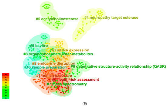 The keywords were clustered using CiteSpace, and the labels were extracted using the log-likelihood ratio (LLR) algorithm; the results are shown in Figure 7B. Modularity and silhouette are important parameters for evaluating the clustering effect in the clustering map. The value interval of both indices is 0~1; the closer the value is to 1, the closer the connection between nodes in the cluster, and the better the clustering result (Table S4). A modality value >0.3 indicates that the clustering network structure is significant; a silhouette value >0.7 indicates that the results have high confidence [59]. In this study, the modality and silhouette values were 0.6355 and 0.8216, respectively, which indicates that the clusters were well structured and homogeneous and that the clustering results had a high degree of confidence. The cluster starts at 0, and the smaller the number is, the more members are included in the cluster; the major categories with more than 20 members were selected for analysis. Eleven major research directions were detected during the period of 2003–2023 (Figure 7B). The largest cluster was “health risk assessment”, followed by “human exposure”, “endocrine disruption”, “mRNA expression”, and “neuropathy target esterase”. Table S9 shows the details of each classification cluster and the main keywords used.