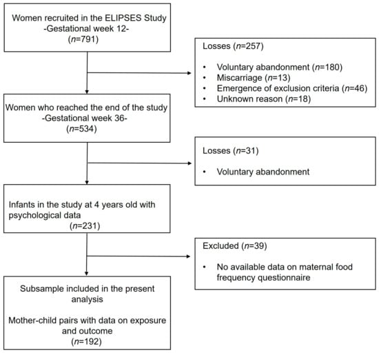 - Kou, X.; Bulló, M.; Rovira, J.; Díaz-López, A.; Arija, V. Dietary Intake of Metals, Metalloids, and Persistent Organic Pollutants in Spanish Pregnant Women. ECLIPSES Study. Chemosphere 2023, 344, 140319. [Google Scholar] [CrossRef] [PubMed]