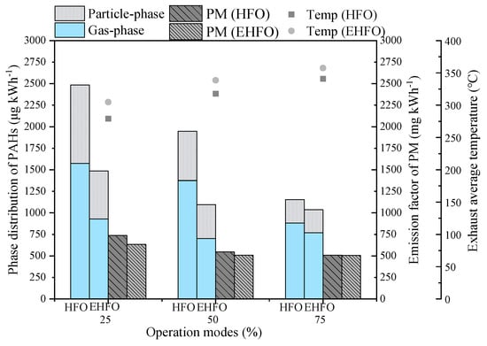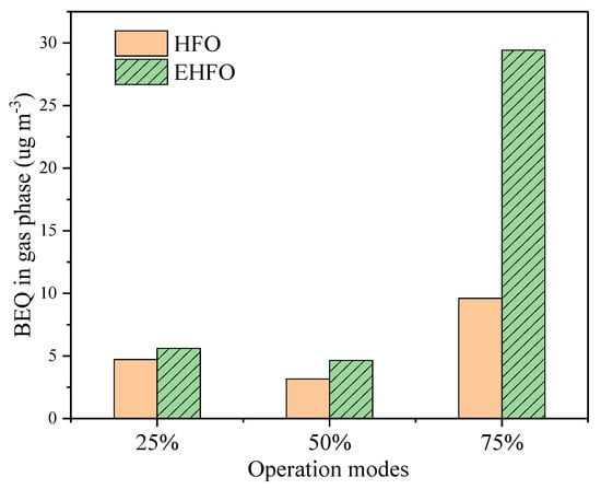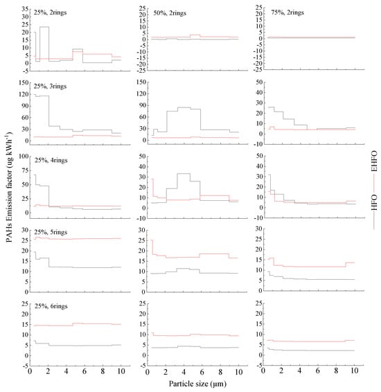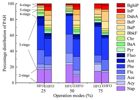Figure 3 plotted that the particulate PAHs mostly peaked in fine sizes in the HFO exhausts, especially at the load of 25%. By comparison, emulsification could weaken the peak in fine sizes for LMW-PAHs and enhance the emissions of HMW-PAHs in all sizes of particles. The size distribution of PAHs in HFO and EHFO exhausts both deviated from the equilibrium distribution rule in ambient air, i.e., LMW- and HMW-PAHs affiliated with coarse and fine particles, respectively [,].