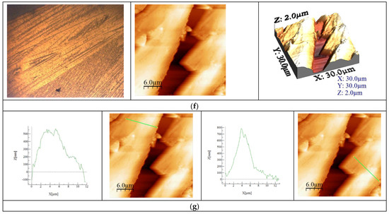 Recorded microscopy images reveal the presence of an agglomerated needle formation in the case of the new prepared BFO composite. This difference becomes more evident when the AFM images are analyzed, revealing that during synthesis wires are created, with longer ones tending to overgrow smaller ones, as can be observed from the images depicted in Figure 5f. The data presented in Figure 5g show that the length of the wires have a value around 12 μm and a height between 500 and 700 nm. Based on the recorded AFM images, the values of specific parameters were calculated (Average roughness (Sa), Mean Square Root Roughness (Sq), Maximum peak height (Sp), Maximum valley depth (Sv), Maximum peak-to valley height (Sy)), the values of which are shown in Table 1.