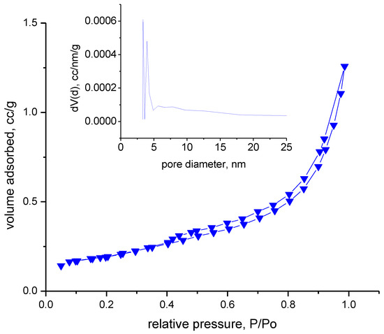 The adsorption–desorption isotherms were recorded in a nitrogen atmosphere at 77 K. Prior to this, the samples were degassed in a vacuum at room temperature for 17 h. Analyzing the adsorption–desorption isotherms obtained, shown in Figure 8, we can specify that the material indicates type IVa with hysteresis type H3, specific to samples in the form of non-rigid aggregates with flat-like particles. In the inset figure presented in Figure 8, it can be seen that the pore distribution is multimodal, with most pores below 5 nm.