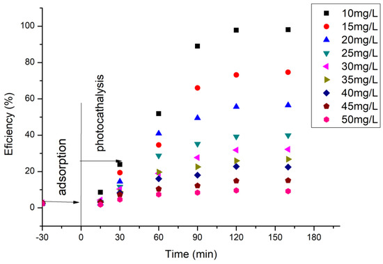 To establish the optimal concentration of cytarabine that can be degraded by the synthesized material, the initial concentration of cytarabine was varied in the range of 10 to 50 mg/L cytarabine (solutions containing 10, 15, 20, 25, 30, 35, 40, 45 and 50 mg/L were used). Each sample, before UV irradiation, was left to adsorb in the dark for 30 min. The distance of the sample from the irradiation source was 3 cm, the amount of material was 0.15 g, and the irradiation times varied in the range of 30–120 min.