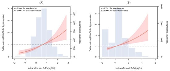 The multivariate-adjusted restricted cubic spline analyses showed positive associations with the hypertension risk for both ln-transformed blood lead and cadmium concentrations (all p for overall < 0.0001, p for non-linearity of 0.3008 and 0.7611, respectively) (Figure 2).