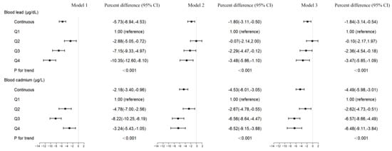 Based on linear regression, Figure 3 displays the percent difference (95% CIs) of LTL for blood lead and cadmium concentrations. We discovered statistically significant negative relationships for both ln-transformed blood lead and cadmium contents in all models. In three models, the LTL of the second to fourth quartiles of blood cadmium levels was lower than that of the reference group (all p < 0.05). As for blood lead levels, we found the same result only in the unadjusted model (Model 1) (both p < 0.05). The second quartile showed no significant correlation with LTL once variables were taken into account (Model 2 and Model 3), while the third and fourth quartiles did.