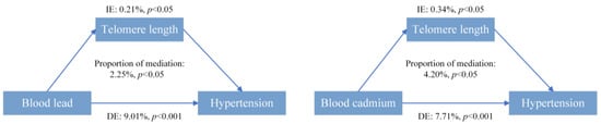 Furthermore, for the purpose of evaluating the potential effects of LTL, we performed a simple mediation effect analysis. The findings demonstrated that correlations between exposure to lead and cadmium with the development of hypertension were significantly mediated by LTL. The value of mediating effects was 0.0021 and 0.0034, and the proportion of mediation was 2.25% and 4.20%, respectively (Figure 4).