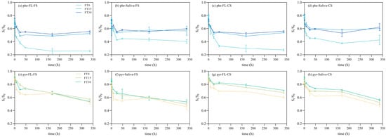 Desorption kinetics curves phenanthrene (a–d) and pyrene (e–h) in different scenarios (Note: Frap—rapid desorbing fraction; phe—phenanthrene; pyr—pyrene; FS—ferrallitic soil; CS—calcareous soil; FL—simulated lung fluid; FT—freeze-thaw cycle).