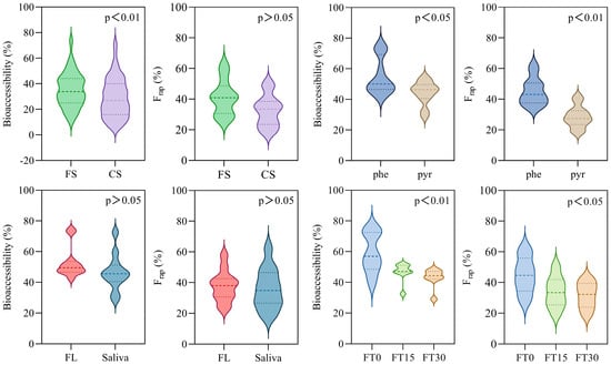 The type of simulated body fluid also had an impact on the release rates of PAHs. Higher bioaccessibility values were observed in simulated lung fluid, ranging from 42.48% to 74.46%, which were higher than those in simulated saliva (28.99–62.41%). Unexpectedly, the difference in release rates between the two body fluids did not reach statistical significance (p > 0.05). Furthermore, PAHs demonstrated higher rapid desorbing fractions in simulated lung fluid (for phenanthrene: 37.06–57.90%, and for pyrene: 23.00–41.58%) than in simulated saliva (for phenanthrene: 34.00–62.29%, and for pyrene: 18.50–39.00%); yet, this difference was not statistically significant (p > 0.05) (Figure 3).