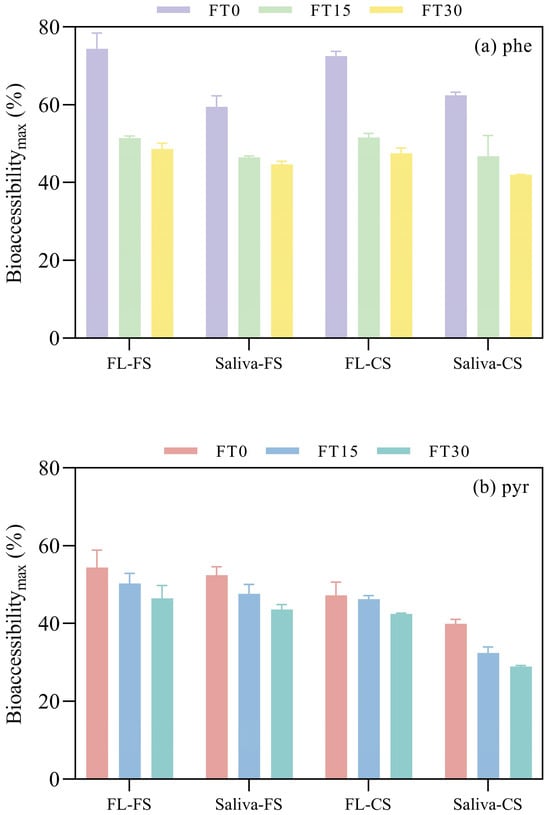 Maximum bioaccessibilities of (a) phenanthrene and (b) pyrene in different scenarios (abbreviations are similar to Figure 2).
