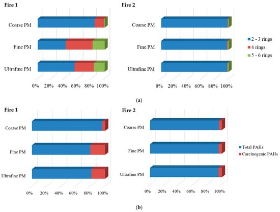 Distribution of PAHs according to (a) the number of aromatic rings during prescribed fires and (b) total PAHs and total carcinogenic PAHs in Fires 1 and 2.