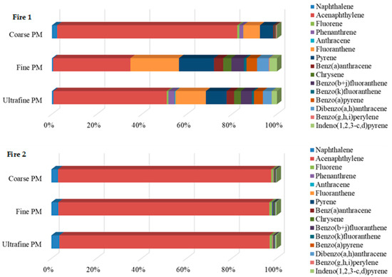 Acenaphthylene (832.9 ng/m3 in fine, 219.7 ng/m3 in ultrafine, and 83.7 ng/m3 in coarse PM), fluoranthene (523.0 ng/m3 in fine, 58.9 ng/m3 in ultrafine, and 7.69 ng/m3 in coarse PM), and pyrene (379.0 ng/m3 in fine, 40.5 ng/m3 in ultrafine, and 6.20 ng/m3 in coarse PM) were the predominant compounds in the PM collected in the air of firefighters during Fire 1 (Table 1). Altogether, these three compounds accounted for 93.3%, 73.1%, and 63.7% of total PAHs in the coarse, ultrafine, and fine PM, respectively (Figure 3). Regarding Fire 2, acenaphthylene (191.9 ng/m3 in fine PM, 99.4 ng/m3 in ultrafine PM, and 93.7 ng/m3 in coarse PM), naphthalene (6.41 ng/m3 in fine, 3.83 ng/m3 in ultrafine, and 2.96 ng/m3 in coarse PM), and fluorene (2.40 ng/m3 in fine, 1.20 ng/m3 in ultrafine, and 0.795 ng/m3 in coarse PM) were the most abundant compounds and represented 98.3%, 97.8%, and 97.4% of the total PAHs in the coarse, ultrafine, and fine PM, respectively (Table 1; Figure 3). Anthracene (0.0667–37.3 ng/m3), benz(a)anthracene (0.400–99.0 ng/m3), benzofluoranthene isomers (0.0564–135.0 ng/m3), BaP (0.284–114.4 ng/m3), and benzo(g,h,i)perylene (0.157–6.93 ng/m3) were detected only in samples from Fire 1, while dibenzo(a,l)pyrene (0.78–0.498 ng/m3) was detected only in fine PM from Fire 2 (Table 1).