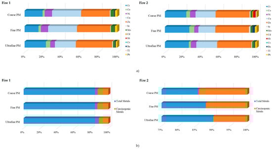 The concentrations of total PM-bound (possible/probable) carcinogenic metal(loid)s (Co, Ni, Cd, Sb, and Pb) were increased in Fire 1 compared to Fire 2 (83.5 versus 30.8 ng/m3) and represented 12.6% and 11.7% of total PM, respectively (Table 2). The levels of carcinogenic metal(loid)s were increased in fine PM (54.58 ng/m3 in Fire 1 and 14.85 ng/m3 in Fire 2) than in ultrafine (13.49 ng/m3 versus 8.924 ng/m3) and coarse (15.45 ng/m3 versus 7.017 ng/m3) PM (Table 2), accounting for 11.3–13.0% and 9.96–14.1% of total PM (Figure 4b).