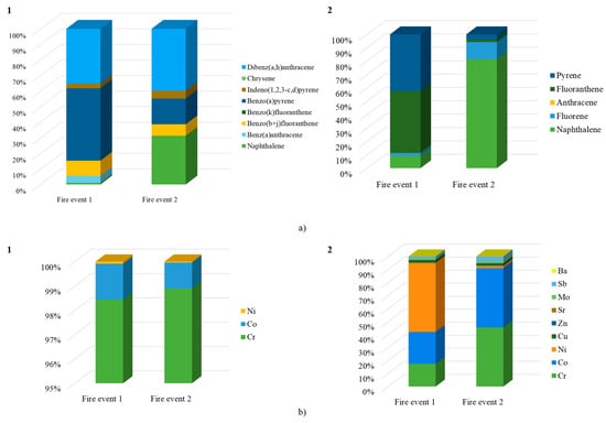Contribution of (a) PM-bound PAHs (%) and (b) PM-bound metals (%) to (1) total TR and (2) total THQ values due to inhalation of PM during prescribed Fire 1 and 2.