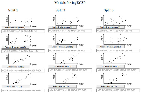 Table 2 gives the statistical characteristics of models for logEC50. More details on the statistical parameters are given in Table S5 in Supplementary Materials. These models are the following, for the three splits: