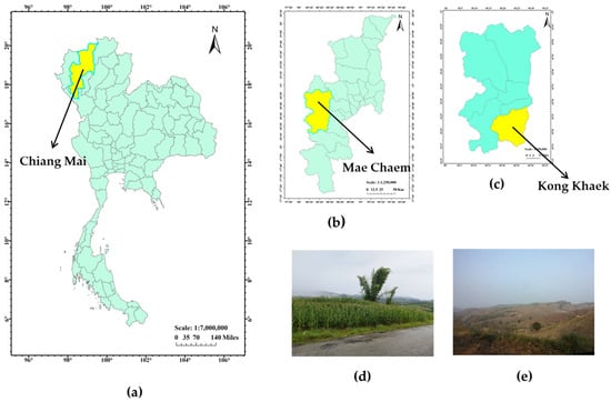 Map of the study area. (a) Map of Chiang Mai in upper northern Thailand. (b) Map of Mae Cheam district. (c) Map of Kong Khaek subdistrict. (d) Maize (corn) plantation and (e) bald mountain with maize cropping in Kong Khaek subdistrict.