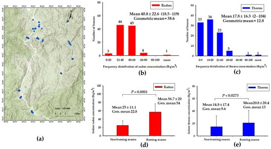 To further investigate the association between indoor radon/thoron concentrations and high air pollution. We needed to obtain indoor radon and thoron concentrations in Kong Khaek subdistrict during non-burning (September–November 2022) and burning (December 2022–March 2023) seasons. Figure 2d,c show a significant statistical difference (p < 0.0001 and 0.0273) between indoor radon and thoron concentrations during non-burning and burning seasons, respectively. The average values of indoor radon and thoron concentrations were higher during the burning period (56.7 ± 20 and 20.8 ± 20.4 Bq/m3) than in the non-burning period (25 ± 11.1 and 14.8 ± 17.4 Bq/m3), respectively. This study demonstrates that indoor radon and thoron concentrations during the burning period exceeded the worldwide average values in areas with high pollution.