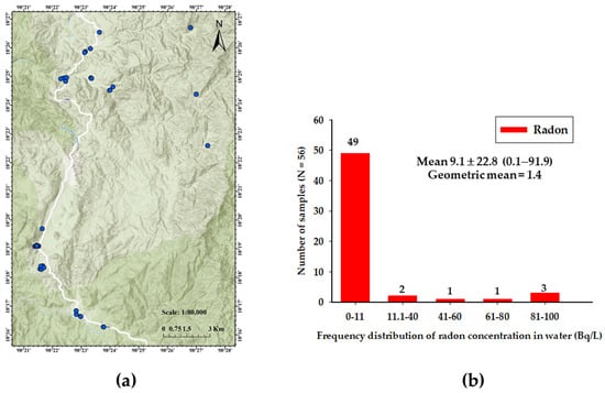 Radon concentration in drinking water. (a) Location of the sampling sites. (b) Frequency distribution of radon concentration levels in drinking water.