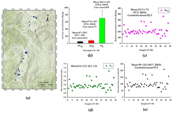 Figure 4e displays the absorbed gamma radiation dose rate in outdoor air (Da) at a height of 1 m above the ground surface for 48 soil samples. The range of Da in the study area was found to be from 40.7 to 208.8 nGy/h, with an average value of 98 ± 32.5 nGy/h. The calculated average value of Da was higher than the worldwide average Da of 59 nGy/h and the national levels of Thailand (35–44 nGy/h) [,].