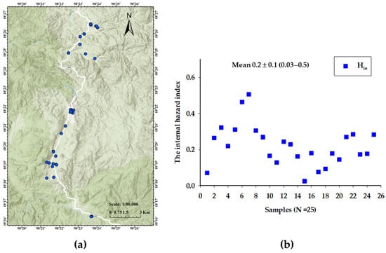 The internal hazard index (Hin) was used to evaluate the harmful effect of internal exposure to natural radioactive nuclide. To calculate, the Hin, Equation (12) was used [].