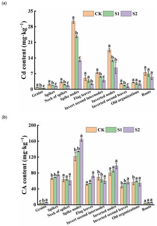 Content of Cd (a) and CA (b) in different tissues of rice. Different letters indicate significant difference (p < 0.05) among treatments in the same organ according to Duncan’s test.