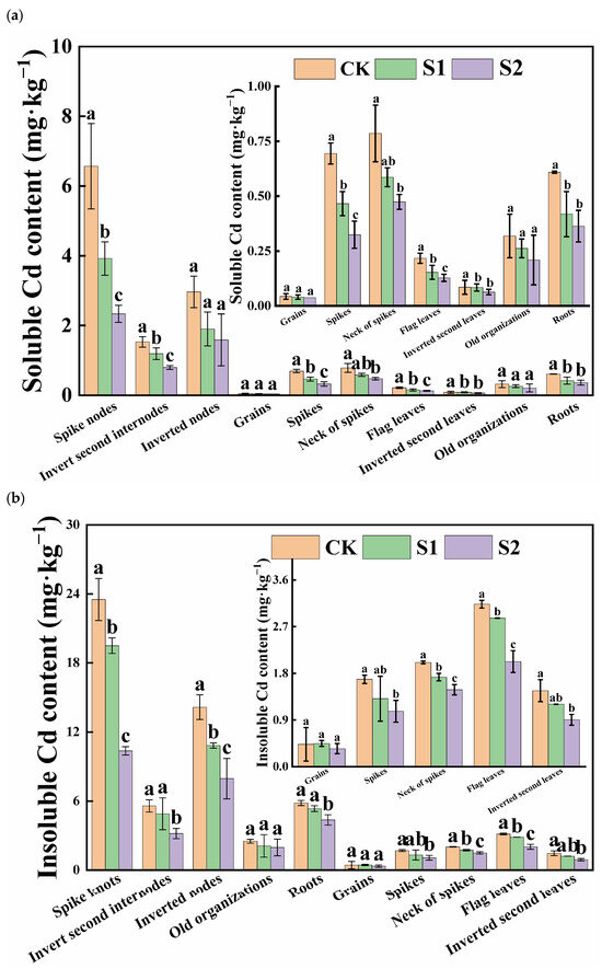 Content of soluble Cd (a) and insoluble Cd (b) in different tissues of rice. Different letters indicate significant difference (p < 0.05) among treatments in the same organ according to Duncan’s test.