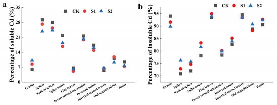 Percentage of soluble Cd (a) and insoluble Cd (b) in different tissues of rice.