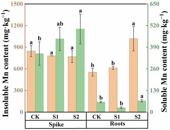 Content of soluble and insoluble Mn in spikes and roots of rice treated with different concentrations of CA. Data represent the means of three repetitions ± standard deviation and lowercase letters represent significant differences between different CA treatments (p < 0.05).