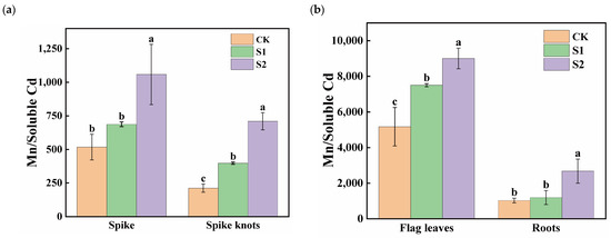 Effect of different concentrations of CA on Mn/soluble Cd in spikes and spike nodes (a) and flag leaves and roots (b) of rice. Data represent the means of three repetitions ± standard deviation and lowercase letters represent significant differences between different CA treatments (p < 0.05).
