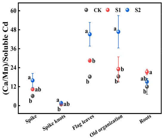 Impact of different concentrations of CA on (Ca:Mn)/soluble Cd in different key organs of rice. Data represent the means of three repetitions ± standard deviation and lowercase letters represent significant differences between different CA treatments (p < 0.05).
