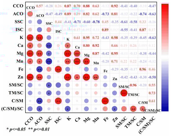 Correlation analysis among the treatments. Data represent the mean of three replicates ± standard deviation. “CCO” indicates Cd content in organs, “ACO” indicates CA content in organs, “SSC” indicates soluble Cd content, “ISC” indicates insoluble Cd content, “SM/SC” indicates soluble Mn/soluble Cd, “TM/SC” indicates total Mn/soluble Cd, “C/SM” indicates Ca/soluble Mn, “(C/SM)/SC” indicates (Ca/soluble Mn)/soluble Cd.