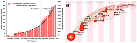 The results of the statistical analysis of the PBPK-related literature in the WOS databases are shown in Figure 1. It was found that the number of publications increased from 2 in 1996 to 457 in 2023. According to the statistical results of the first three months (188 articles), the number of publications in 2024 is likely to exceed that in 2023. It can also be seen from Figure 1A that the number of publications has a slower growth rate from 1996 to 2014. The number of papers increased rapidly after 2014. Especially in 2015, the number of papers published increased by 14.6% compared with the number in 2014. Increasing advanced computer science has made it possible for the calculation of complex mathematical equations for PBPK, which could be the potential reason that indirectly promoted PBPK research from 2014 to 2024. To date, the total number of publications is nearly 4000.