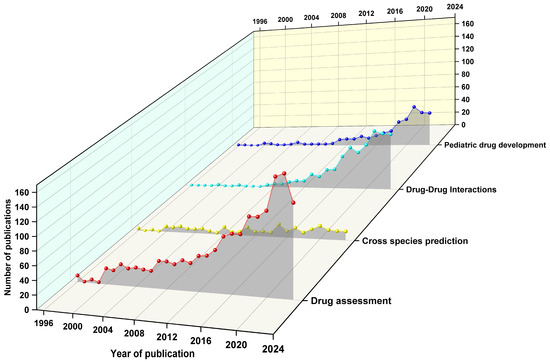 As an important research target, the circle of “risk assessment” has both high occurrence frequency and a long research history. It can also be found that the circle of “risk assessment” has a close relationship with the circles of “exposure”, “rats”, and “tissue distribution”, which indicates that it is widely used in research focused on drug assessment and drug tests. The label “in vitro” has links with the circles of “rats”, “human”, and “prediction”. They are always used in the animal-to-human extrapolation of drugs or chemicals. The keyword “DDI” has associations with labels including “inhibition”, “pharmacokinetics”, and “metabolism”, which indicates another research hotspot of “drug–drug interactions”. Finally, the circle of “children” is close to “humans”, “in vitro”, and “exposure”, which indicates another application of PBPK, the research on pediatric drug development. Therefore, the existing articles were categorized into four main areas based on the frequency of keyword occurrences (Figure 3), including “drug assessment”, “cross-species prediction”, “drug–drug interactions (DDI)”, and “pediatric drug development” [3,26].