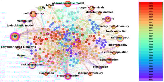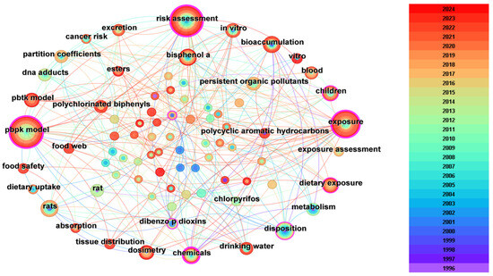 Map of co-occurring keywords. The circle represents the keyword cited in the PBPK research. The larger the diameter of the circle, the more frequently the keywords appear. The color represents the year of the publication. The richer the color of the circles and connecting lines, the longer the time span over which the keyword appears.