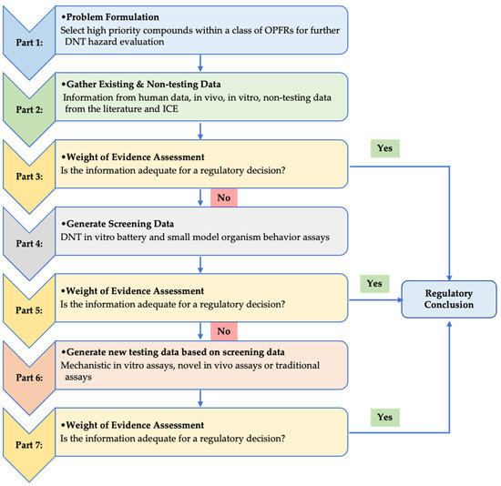 A petition to the U.S. Consumer Product Safety Commission (CPSC) to ban several flame-retardant products was submitted by a coalition of organizations and individuals to initiate a regulatory action under the U.S. Federal Hazardous Substances Act (FHSA). To determine if a ban would be enacted, the U.S. CPSC must firstly perform a hazard assessment to evaluate whether the chemical is toxic, as defined by the U.S. FHSA. Accordingly, OPFRs were nominated by the U.S. CPSC to the National Toxicology Program (NTP), National Institute of Environmental Health Sciences (NIEHS), for testing based on predicted increased exposure and lack of hazard characterization data. OPFRs are structurally similar to organophosphorus insecticides that are well-established (developmental) neurotoxicants [7,8]. Combined with the developing brain being especially vulnerable to chemical perturbation, this makes this compound class of high concern for developmental neurotoxicity (DNT) effects [9]. The traditional DNT in vivo guideline study takes years to conduct, is expensive, and requires the use of large numbers of animals—an untenable approach for screening large numbers of compounds. Further, the animal studies are not always reflective of the developing nervous system in toddlers and children who are at an increased risk of exposure to these chemicals due to hand-to-mouth behavior [10,11]. Over the past decade, great efforts from the regulatory, scientific, and stakeholder communities have been aimed at developing a DNT in vitro battery (IVB) to enhance DNT assessment [12,13,14]. This battery captures a variety of processes critical to neurodevelopment in vivo, such as cell proliferation, migration, differentiation, synaptogenesis, and network formation and function. The eventual goal of this effort has been to offer a suite of assays that could inform on DNT hazards for regulatory agencies. Recently, the OECD guidance document “Initial Recommendations on Evaluation of Data from the Developmental Neurotoxicity (DNT) In Vitro Testing Battery” [15] was published with specific Integrated Approaches to Testing and Assessment (IATA) case studies demonstrating the application and interpretation of the DNT testing battery [16]. The IATA framework was developed by the OECD and allows integration of all available data to be used in regulatory assessment [17]. Hence, an IATA case study was developed for OPFRs to demonstrate how a DNT–IVB combined with behavior assays in small model organisms (here after referred as the DNT battery) can be applied to prioritize a class of chemicals for further testing (Figure 1).