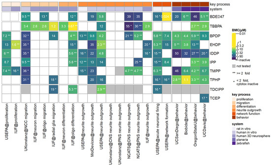 - Klose, J.; Pahl, M.; Bartmann, K.; Bendt, F.; Blum, J.; Dolde, X.; Forster, N.; Holzer, A.K.; Hubenthal, U.; Kessel, H.E.; et al. Neurodevelopmental toxicity assessment of flame retardants using a human DNT in vitro testing battery. Cell Biol. Toxicol. 2022, 38, 781–807. [Google Scholar] [CrossRef] [PubMed]