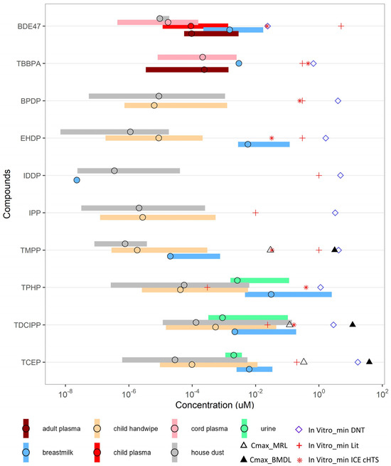 Organophosphorus flame retardants (OPFRs) are abundant and persistent in the environment but have limited toxicity information. Their similarity in structure to organophosphate pesticides presents great concern for developmental neurotoxicity (DNT). However, current in vivo testing is not suitable to provide DNT information on the amount of OPFRs that lack data. Over the past decade, an in vitro battery was developed to enhance DNT assessment, consisting of assays that evaluate cellular processes in neurodevelopment and function. In this study, behavioral data of small model organisms were also included. To assess if these assays provide sufficient mechanistic coverage to prioritize chemicals for further testing and/or identify hazards, an integrated approach to testing and assessment (IATA) was developed with additional information from the Integrated Chemical Environment (ICE) and the literature. Human biomonitoring and exposure data were identified and physiologically-based toxicokinetic models were applied to relate in vitro toxicity data to human exposure based on maximum plasma concentration. Eight OPFRs were evaluated, including aromatic OPFRs (triphenyl phosphate (TPHP), isopropylated phenyl phosphate (IPP), 2-ethylhexyl diphenyl phosphate (EHDP), tricresyl phosphate (TMPP), isodecyl diphenyl phosphate (IDDP), tert-butylphenyl diphenyl phosphate (BPDP)) and halogenated FRs ((Tris(1,3-dichloro-2-propyl) phosphate (TDCIPP), tris(2-chloroethyl) phosphate (TCEP)). Two representative brominated flame retardants (BFRs) (2,2′4,4′-tetrabromodiphenyl ether (BDE-47) and 3,3′,5,5′-tetrabromobisphenol A (TBBPA)) with known DNT potential were selected for toxicity benchmarking. Data from the DNT battery indicate that the aromatic OPFRs have activity at similar concentrations as the BFRs and should therefore be evaluated further. However, these assays provide limited information on the mechanism of the compounds. By integrating information from ICE and the literature, endocrine disruption was identified as a potential mechanism. This IATA case study indicates that human exposure to some OPFRs could lead to a plasma concentration similar to those exerting in vitro activities, indicating potential concern for human health.