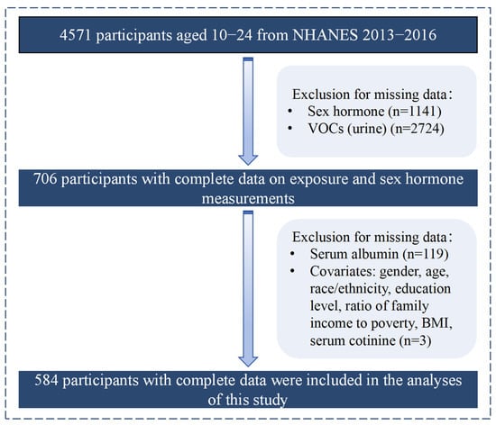 We utilized publicly available data from two cycles (2013–2014 and 2015–2016) from the NHANES. Participants whose data were collected before 2013 were excluded due to the lack of complete sex hormone data. A total of 584 adolescents with complete survey data on selected urinary mVOCs, serum sex hormones, serum albumin, and selected covariates were included in this study. The participant screening process is shown in Figure 1.