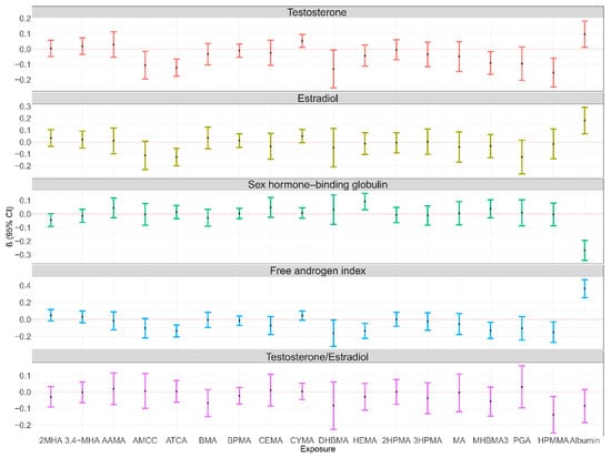 Association of single exposure to mVOCs and serum albumin exposure with sex hormones in the NHANES, 2013–2016 (N = 584). Notes: 2MHA: urinary 2-Methylhippuric acid; 3,4-MHA: urinary 3- and 4-Methylhippuric acid; AAMA: urinary N-Acetyl-S-(2-carbamoylethyl)-L-cysteine; AMCC: urinary N-Acetyl-S-(N-methylcarbamoyl)-L-cysteine; ATCA: urinary 2-Aminothiazoline-4-carboxylic acid; BMA: urinary N-Acetyl-S-(benzyl)-L-cysteine; BPMA: urinary N-Acetyl-S-(n-propyl)-L-cysteine; CEMA: urinary N-Acetyl-S-(2-carboxyethyl)-L-cysteine; CYMA: urinary N-Acetyl-S-(2-cyanoethyl)-L-cysteine; DHBMA: urinary N-Acetyl-S-(3,4-dihydroxybutyl)-L-cysteine; HEMA: urinary N-Acetyl-S-(2-hydroxyethyl)-L-cysteine; 2HPMA: urinary N-Acetyl-S-(2-hydroxypropyl)-L-cysteine; 3HPMA: urinary N-Acetyl-S-(3-hydroxypropyl)-L-cysteine; MA: urinary Mandelic acid; MHBMA3: urinary N-Acetyl-S-(4-hydroxy-2-butenyl)-L-cysteine; PGA: urinary Phenylglyoxylic acid; and HPMMA: urinary N-Acetyl-S-(3-hydroxypropyl-1-methyl)-L-cysteine. Adjusted for sex, age, race/ethnicity, education level, BMI, serum cotinine concentration, and the ratio of family income to poverty.